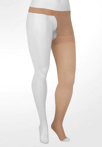 Juzo Soft Compression Thigh High with Hip Attachment is designed for those who only need compression stockings for a single leg or for those who can not use a silicone top band. Easily put on and secure with the hip attachment to prevent slipping. The open-toe design allows freedom of movement for your toes and allows you to wear them with open-toe shoes.
